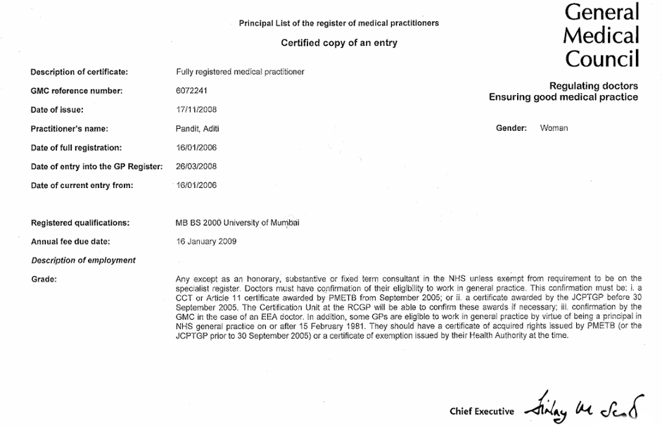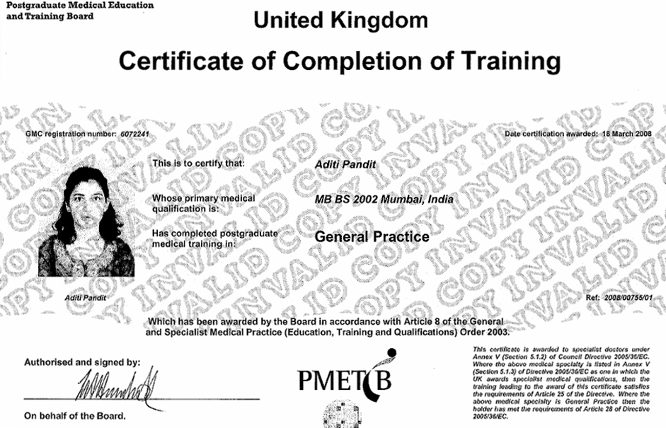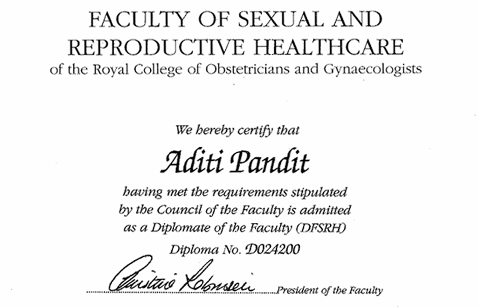 During my hospital jobs, I gained my Diploma in the Royal College of Obstetrics and Gynaecology and Diploma of the Faculty of Reproductive and Sexual Health. I completed my Membership of the Royal College of General Practitioners qualification in 2008. Following this, I have trained in and have a certificate of competence for the insertion of Coils and Implants.